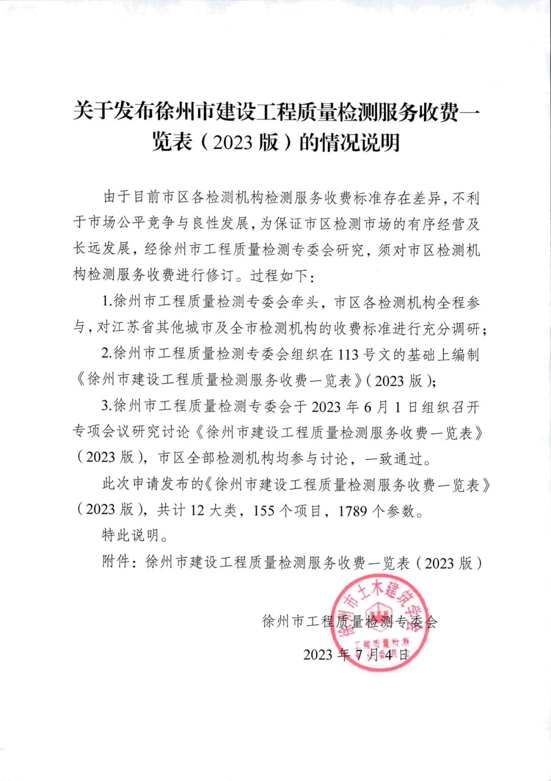 关于执行《徐州市建设工程质量检测服务收费一览表》(2023年版)的通知