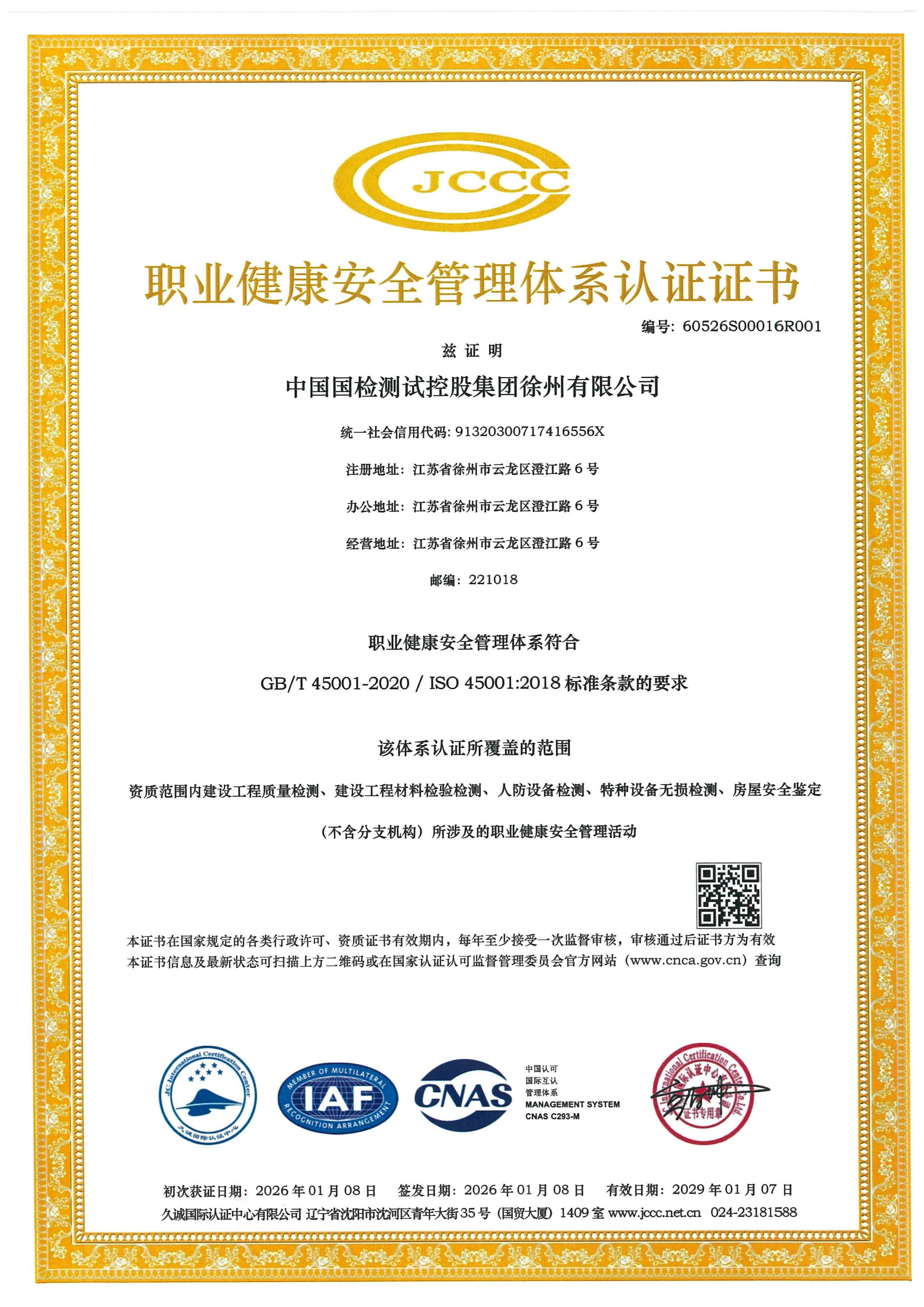 ISO45001职业健康安全管理体系认证证书...